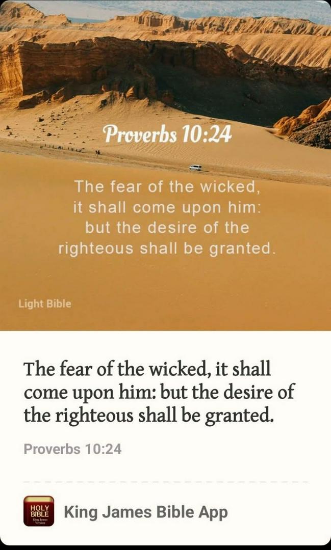Michael Tovornik+FollowInspiration The fears of the wicked will always come to pass as a result of their choice to follow wickedness instead of righteousness. But as Christians, we have no reason to fear because of the love of God that resides in our heart. Perfect love has cast out all our fear. Instead, we can be expectant, because the desires of the righteous are always met. Prayer Dear God, I am grateful that I am identified as righteous and never as wicked. Father, I am grateful that I have nothing to fear but everything to look forward to because You have made me righteous. Lord, I pray for the wicked too, that they will see the wrong in their actions, and they will come to You, realizing that they need a Savior. In Jesus' name, I pray. Amen.415Share