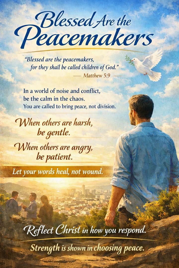 RonC+Follow"Blessed Are the Peacemakers” Inspired by Sermon on the Mount The day begins with noise—demands, opinions, expectations pulling you in every direction. Yet Jesus calls you to something higher: peace. Not passive silence, but active reconciliation. To be a peacemaker is to carry calm into chaos, to refuse to let anger rule your responses. Today, you will be misunderstood at some point. Someone may speak harshly or dismiss your effort. But you are not called to mirror them—you are called to transform the moment. Peace is not weakness; it is controlled strength. It is choosing patience when your flesh wants reaction. Walk into your conversations with intention. Speak slowly. Listen deeply. Let your words heal instead of divide. Every moment is a chance to reflect Christ—not just in what you believe, but in how you respond. You don’t need to control the world around you. Just guard what flows out of you. 274Share