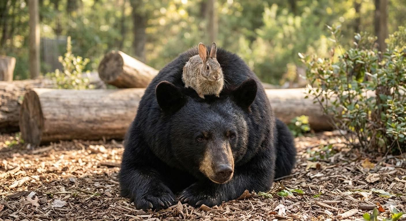 The bonds of this unlikely brotherhood ,catching glimpses of a friendship that defied all logic. Years later, one of the sweetest moments ever captured showed the full-grown black bear resting peacefully, while his tiny bunny friend sat perched right on top of his furry head, as if it were the most natural thing in the world.