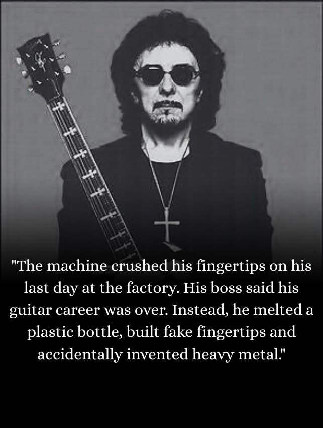 "The machine crushed his fingertips on his last day at the factory. His boss said his guitar career was over. Instead, he melted a plastic bottle, built fake fingertips—and accidentally invented heavy metal. "December 1965. Birmingham, England. Tony Iommi was seventeen years old, working his last shift at a sheet metal factory. It was supposed to be his final day. He'd been offered a professional music gig—a real paying job as a guitarist. He was finally escaping the factory, escaping the grinding industrial monotony of working-class Birmingham. One more shift. Eight more hours. Then freedom. At 4:30 PM—thirty minutes before the end of his shift—Tony was operating a metal press. A massive machine that stamped and cut sheet metal. He was tired. Distracted. Thinking about his new life as a musician. The machine came down. Tony's right hand was underneath it. The press severed the tips of his middle and ring fingers on his right hand—his fretting hand. Blood everywhere. Bone exposed. The fingertips were gone. Crushed beyond repair. When Tony woke up after surgery, heavily bandaged, the first thing he thought about wasn't the pain. It was his guitar. And the second thought: My life is over. For a guitarist, losing fingertips on your fretting hand is catastrophic. Those are the fingers that press down on strings, that create chords, that make music possible. Without fingertips, you have no sensitivity. No control. No ability to feel where the strings are. Tony's factory foreman visited him in the hospital. "Look on the bright side," the foreman said. "At least you weren't going to make a living with your hands anyway. "Tony stared at him. "I'm a guitarist. "The foreman went pale. "Oh. Well... I suppose you'll have to find something else to do. "Tony went home to his parents' house, his hand wrapped in bandages, his dreams destroyed. He was seventeen