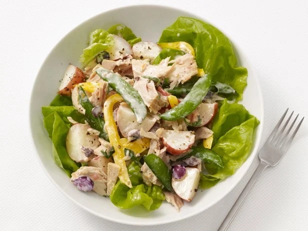 Food+FollowLight Nicoise Salad This salad is packed with briny olives, hearty tuna, tender potatoes and crunchy green beans, but it's lighter than the classic version, thanks to a slimmed-down homemade salad dressing20Share