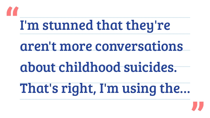 All about the info+FollowI'm stunned that they're aren't more conversations about childhood suicides. That's right, I'm using the word not some obscure language that attempts to protect feelings from the reality of the tragedy. We need to become stronger advocates to protect our children from confusing ideation and delusional interpretations of reality. We're losing a generation of our species, and we can help end this cliff fall. It's up to all of us.102Share