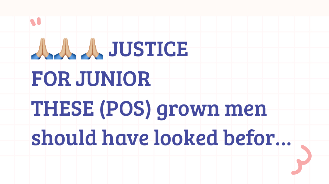 Sarava Chapman+Follow🙏🏼🙏🏼 🙏🏼 JUSTICE FOR JUNIOR THESE (POS) grown men should have looked before anything because it was also a mistaken identity. They thought that he was another kid, and he had to die for it to be proven that he wasn’t a kid that they were looking for the outcome on this case, I pray the mother get complete justice for her son. It won’t bring him back, but she will get some type of closure and peace. I pray for the mother of junior and his family because this was so insane and the girl that started that the sister she should’ve been in jail right along with them so I say just to say I’M ALL IN FOR JUSTICE FOR JUNIOR FLY HIGH YOUNG MAN FLY HIGH🙏🏼🙏🏼🙏🏼😭😭😭10Share