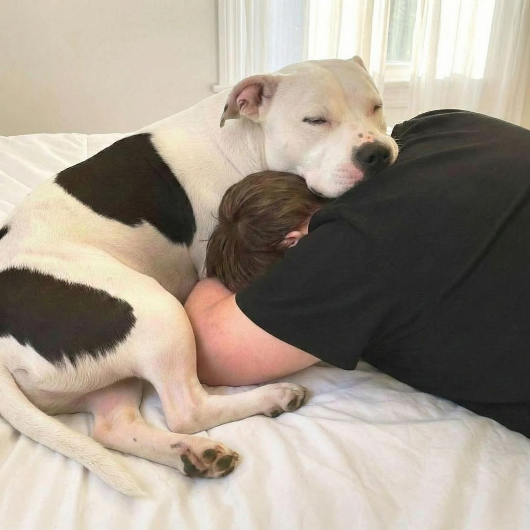 We brought home our new white and black Pitbull rescue just three days ago. The shelter warned us her past hadn’t been kind—returned twice, misunderstood, and terrified of men after surviving abuse from a previous owner. Whenever a man got too close, she would freeze, shake, and completely shut down. She had even snapped once, not out of aggression, but out of sheer fear. They told us she might never truly trust again… that healing could take months, maybe longer. Knowing this, my husband gave her total control. He didn’t try to touch her. Instead, he just sat on the floor every evening, quiet and still, letting her exist in the same room without pressure. The first night, she kept her distance. The second night she inched a little closer, watching him with that uncertain look Pitbulls often carry when life has taught them to be wary of hands instead of hopeful. And then last night… she walked right up to him, curled beside him, and rested her head on his like it was the safest place she had ever known. I snapped the picture through tears. Watching her choose him—after everything she had survived—reminded me exactly why I married this man. He didn’t move for nearly an hour, neck aching and arms completely numb, because he refused to break the moment or risk frightening her. We bought her soft beds and calming treats,. But in the end, what mattered most wasn’t anything we bought. It was patience. It was kindness. It was someone willing to earn her trust on her terms. She’s still cautious with most men and won’t go near my brother or father-in-law yet. But she follows my husband everywhere. At night, she sleeps with her head on his pillow, like she finally found the person she’d been waiting for all along. Sometimes the greatest gift you can give a wounded soul—human or animal—is time, compassion, and the freedom to heal at their own pace.❤️❤️ By born legend