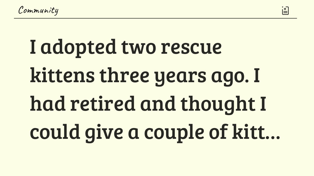 I adopted two rescue kittens three years ago. I had retired and thought I could give a couple of kittens a couple of cats a good home and save them the very first day that I had these cats they hid under my bed which I expected them to do five minutes after being at my house the the male cat, who to this day is now known as the handsome boy that's his name, handsome boy and he is so smart and handsome. Now the female cat I got them both from the same litter ... she is known as the little girl that is her name! they were littermates stayed under the bed would come out eat use the little box and go back in there and hide under my bed so for 18 months, the cat and I just kinda lived in the same house with each other. I didn't pressure her or anything I didn't. I knew that I had to wait and let her come to me. 18 months is what it took here. We are many months later when she doesn't leave my side she is the most lovable smart cat. I got very lucky to get both of these out of the same letter so yes, having patience does pay off.
