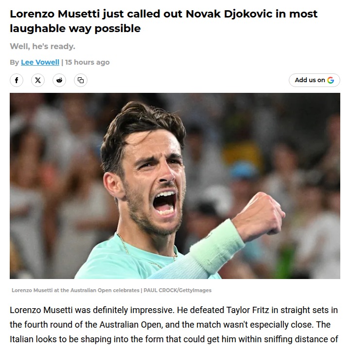 Nicole Baxter+FollowMusetti Seeks Revenge vs Djokovic Down UnderLorenzo Musetti just set the stage for a spicy Aussie Open quarterfinal by calling out the 10-time champ, Novak Djokovic. The Italian, fresh off a dominant win over Fritz, says he’s ready to push the “Djoker” to the limit and get revenge for their last close battle. Musetti’s 1-9 record vs Djokovic isn’t great, but you’ve got to love his belief. Can youth and hunger topple experience and Grand Slam pedigree? #Sports #Tennis #AustralianOpen00Share