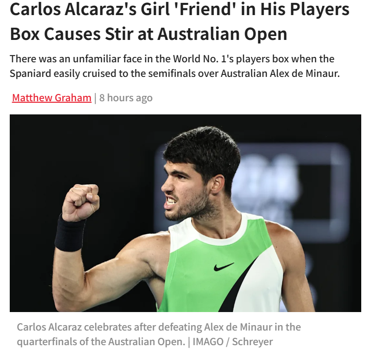 Nicholas Henderson+FollowAlcaraz’s Players Box Mystery at Aus OpenDid anyone else catch the buzz around Carlitos’ players box during his straight-sets win over Demon at the Aussie Open? Fans went wild speculating about the mystery woman spotted courtside, but turns out it was just his friend, DJ Peggy Gou, there for support. King Carlos handled the rumors with his trademark charm—proving once again, he’s got game on and off the court. Thoughts on how the media hypes up his off-court life? #Sports #Tennis #Alcaraz00Share