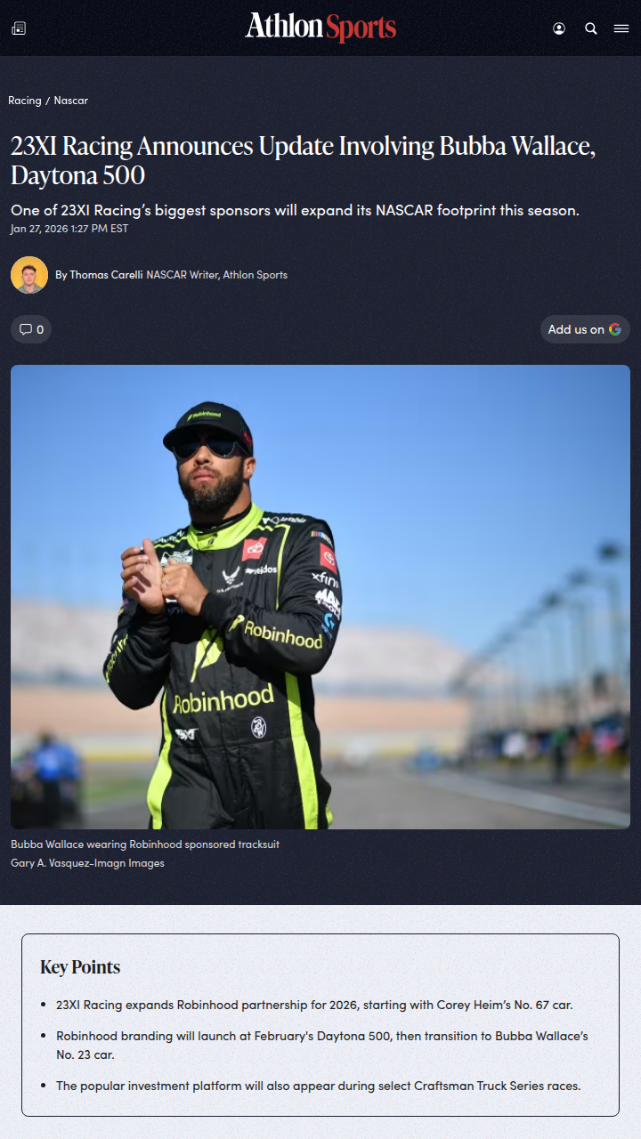Isabel Collier+FollowBubba Wallace & 23XI: Robinhood Joins the RideBig news for the 23XI Racing fam! The team just locked in a major sponsorship extension with Robinhood, starting with Corey Heim’s No. 67 at the Daytona 500 and rolling out to Bubba Wallace’s No. 23 throughout 2026. With Robinhood’s bold green on the cars, 23XI’s three-car lineup is looking stronger than ever. Can Bubba and Heim make a statement at Daytona and spark a new rivalry in the Cup Series? #Sports #Racing #NASCAR00Share