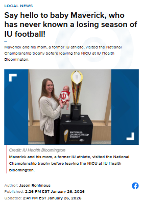 Aaron Taylor+FollowIU’s tiniest fan and a season to rememberImagine being born just in time to witness your team’s first-ever national football championship—and never knowing a losing season! That’s baby Maverick’s story. Born at just 28 weeks and weighing under 3 pounds, Maverick spent his first months in the IU Health Bloomington NICU, surrounded by IU football spirit. Nurses even joked he brought the team good luck! Before heading home, Maverick and his mom, an IU alum, got to see the championship trophy up close. It’s amazing how a community can rally around both a team and its tiniest fans. What’s your favorite memory from this historic season? #Sports #Football #IUFootball00Share