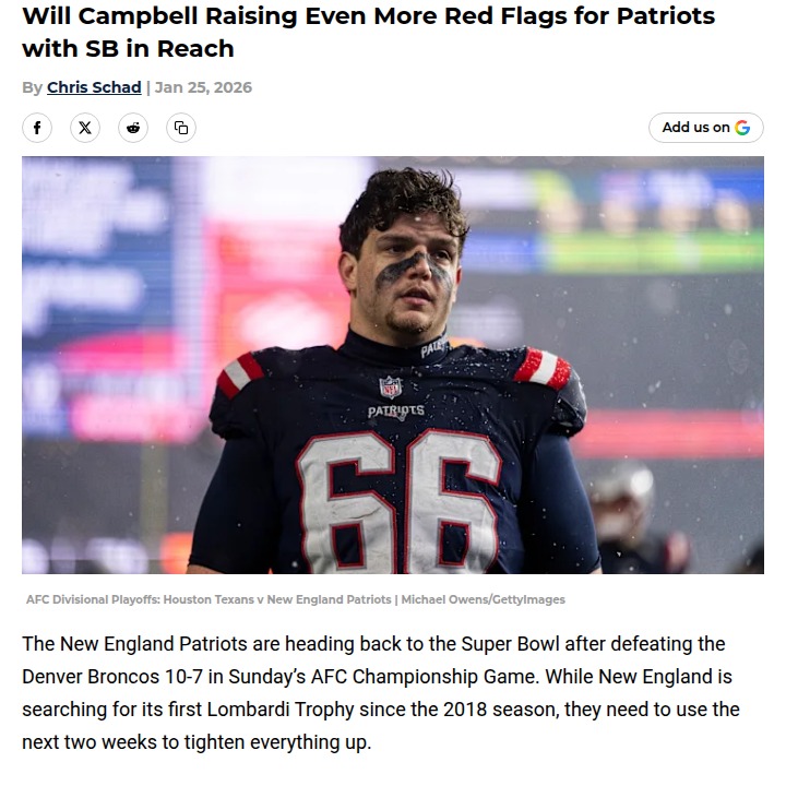 glen25+FollowPatriots’ Super Bowl Hopes Hinge on CampbellFellow Pats fans, we’re back in the big dance, but there’s a real concern on the O-line. Rookie Will Campbell, aka the LSU Wall, has been showing cracks lately—struggling against top-tier edge rushers and racking up penalties. With the Lombardi in sight, can Campbell hold up against the likes of Jared Verse or Demarcus Lawrence? If not, Drake Maye might be running for his life again. Thoughts on moving Campbell inside or sticking it out at LT for one more game? #Sports #Football #PatriotsNation00Share