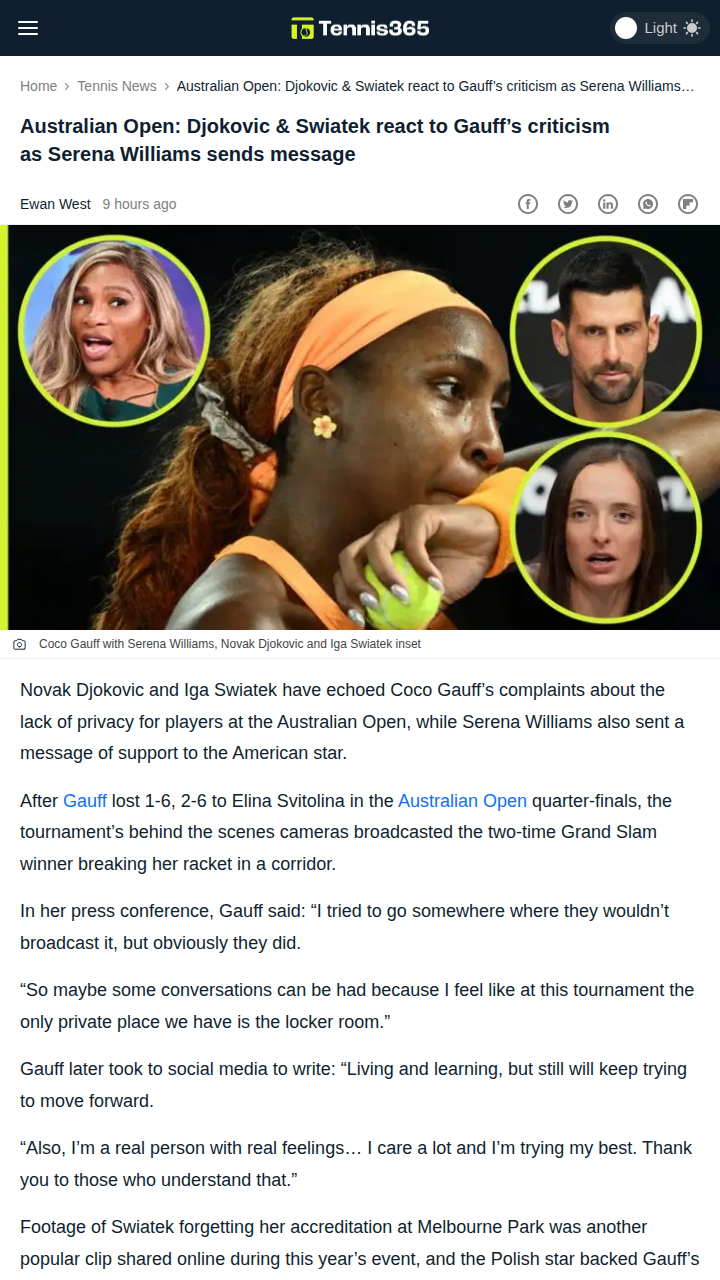 Gregory Costa+FollowDjokovic, Swiatek Back Gauff’s Privacy PleaBig names are rallying behind Coco Gauff after her tough Aussie Open exit and the viral footage of her racket smash. King Novak and Iga “The Silent Assassin” Swiatek both echoed Gauff’s call for more player privacy, saying the constant cameras are crossing a line. Even Serena chimed in, joking she could teach Coco a thing or two about smashing rackets. Is the behind-the-scenes coverage going too far? #Sports #Tennis #AustralianOpen00Share