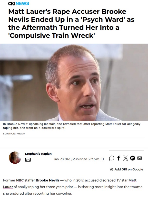 Chad Kemp+FollowBrooke Nevils Reveals Psych Ward Struggle 😳Brooke Nevils just dropped a bombshell about her life after accusing Matt Lauer—she ended up in a psych ward, feeling like a total wreck. Her memoir exposes how the media storm and NBC’s reaction left her spiraling. Fans are debating if NBC did enough to protect her or just protected their star. The plot twist? Nevils says she blamed herself for everything. This is way deeper than anyone thought! #Entertainment #Celebrity #BrookeNevils00Share