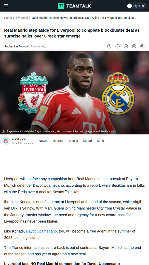 Maurice Miller+FollowReds Win Upamecano Race—Madrid Out!Huge news for Reds fans: Liverpool are now in pole position to sign Dayot Upamecano, with Los Blancos stepping aside due to his hefty wage demands. With Big Virg not getting any younger and Konate’s contract winding down, this could be a game-changing move for Klopp’s backline. Madrid’s past Alaba gamble seems to have scared them off, leaving the path clear for the Reds to snap up the French star. Thoughts on this transfer saga? #Sports #Soccer #LFC00Share