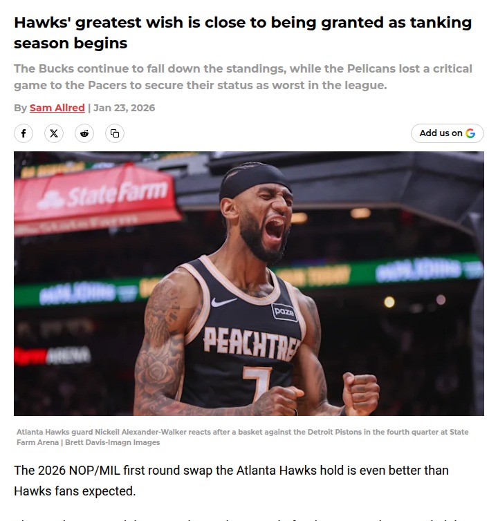 Oscar Gonzalez+FollowHawks’ Draft Jackpot: Bucks & Pels Tanking?Hawks fans, is this the most lopsided draft swap ever? The NOP/MIL pick swap Atlanta landed is looking golden as both the Pelicans and Bucks are tanking hard—despite the Greek Freak still balling in Milwaukee. With Zion and Dejounte out, and the Bucks in freefall, Atlanta suddenly has a legit 20% shot at the #1 pick. Could this be the break we’ve been waiting for? Let’s talk odds, rivalries, and what this means for the rebuild. #Sports #Basketball #Hawks00Share