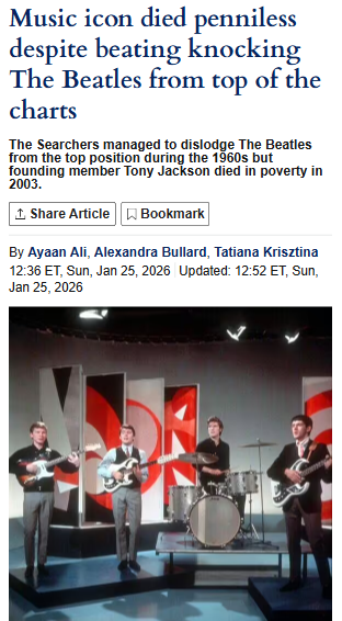 Suzanne Glover+FollowMusic Icon Knocked Beatles Off Charts 😱Did you know The Searchers actually dethroned The Beatles from #1 in the 60s? Wild, right? But here’s the twist: Tony Jackson, their original lead singer, ended up dying penniless and alone after leaving the band. Fans are still debating if he deserved more recognition—some say he was as influential as Lennon! It’s tragic how fame doesn’t always mean fortune or a happy ending. #Entertainment #Music #MusicHistory00Share