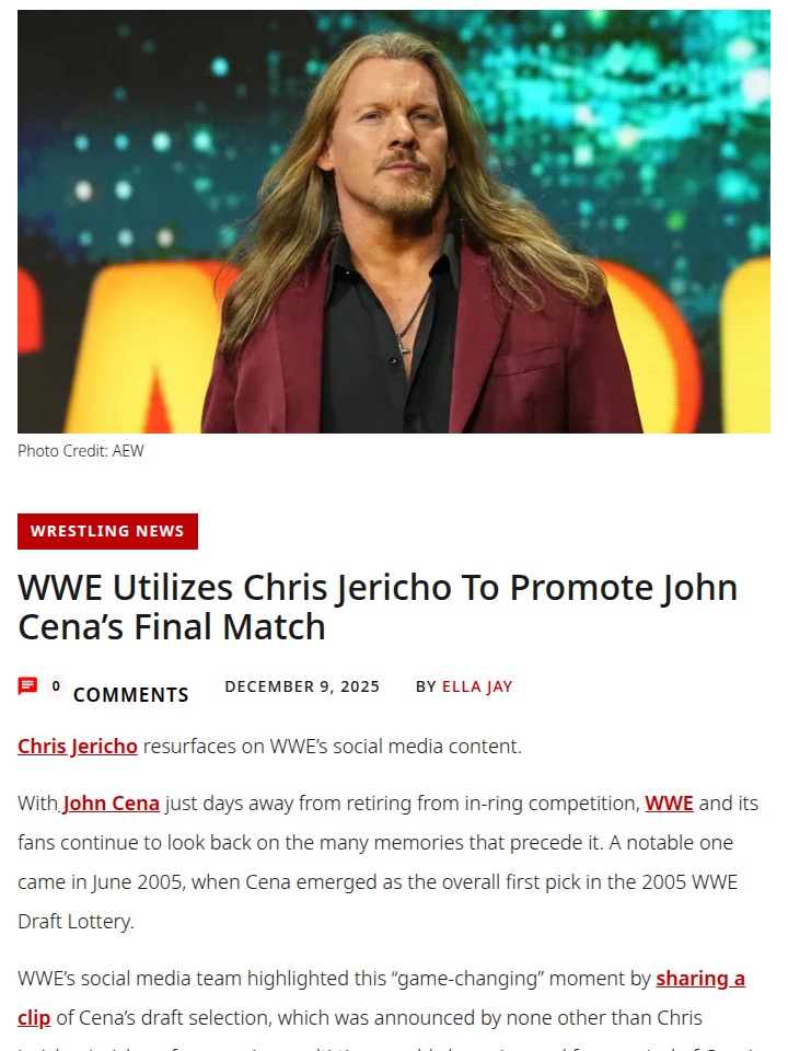 Stephanie Bailey+FollowJericho Returns to Hype Cena’s Last StandY2J just popped up on WWE socials to help hype up John Cena’s final match, and fans are buzzing! WWE threw it back to the 2005 Draft, when Jericho announced Cena as the #1 pick—a true game-changer. Now, with Jericho’s AEW contract expiring soon, could we see him back in WWE for one last rivalry or even a retirement run? The timing is wild, and the speculation is real. Thoughts on this crossover moment? #Sports #Wrestling #WWE110Share