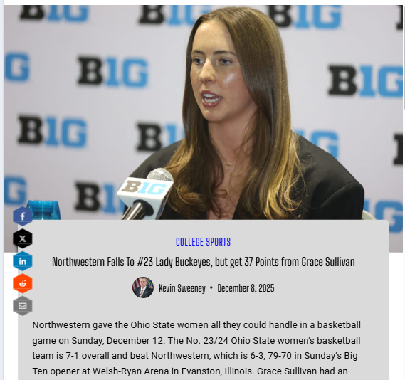 AmberAbyss+FollowNorthwestern’s Grace Sullivan drops 37 vs Ohio StateGrace Sullivan put on a show with 37 points—one of the highest single-game totals in Northwestern history—but it wasn’t quite enough to topple the newly ranked #23 Ohio State Lady Buckeyes. The Wildcats came out strong and even led after the first quarter, but Ohio State’s depth and late-game runs made the difference in a 79-70 win. With Sullivan’s breakout performance and the Buckeyes’ balanced attack, this Big Ten opener had all the drama. How do you see the rest of the season shaping up for both teams after this battle? #Sports #Northwestern #OhioState00Share