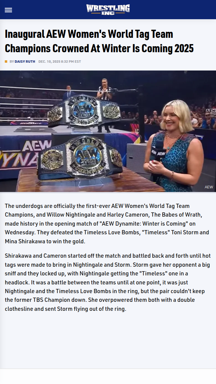Diamond Horton+FollowBabes of Wrath Make AEW Tag History!What a wild opener at Winter Is Coming! The Babes of Wrath—Willow Nightingale and Harley Cameron—just etched their names in AEW history as the first-ever Women's World Tag Team Champs. They outlasted the Timeless Love Bombs, with Nightingale showing why she's a powerhouse, especially in that clutch save against "Timeless" Toni Storm. Both teams showed respect post-match, but you could feel the rivalry brewing. Thoughts on this new era for AEW’s women’s division? #Sports #Wrestling #AEW20Share
