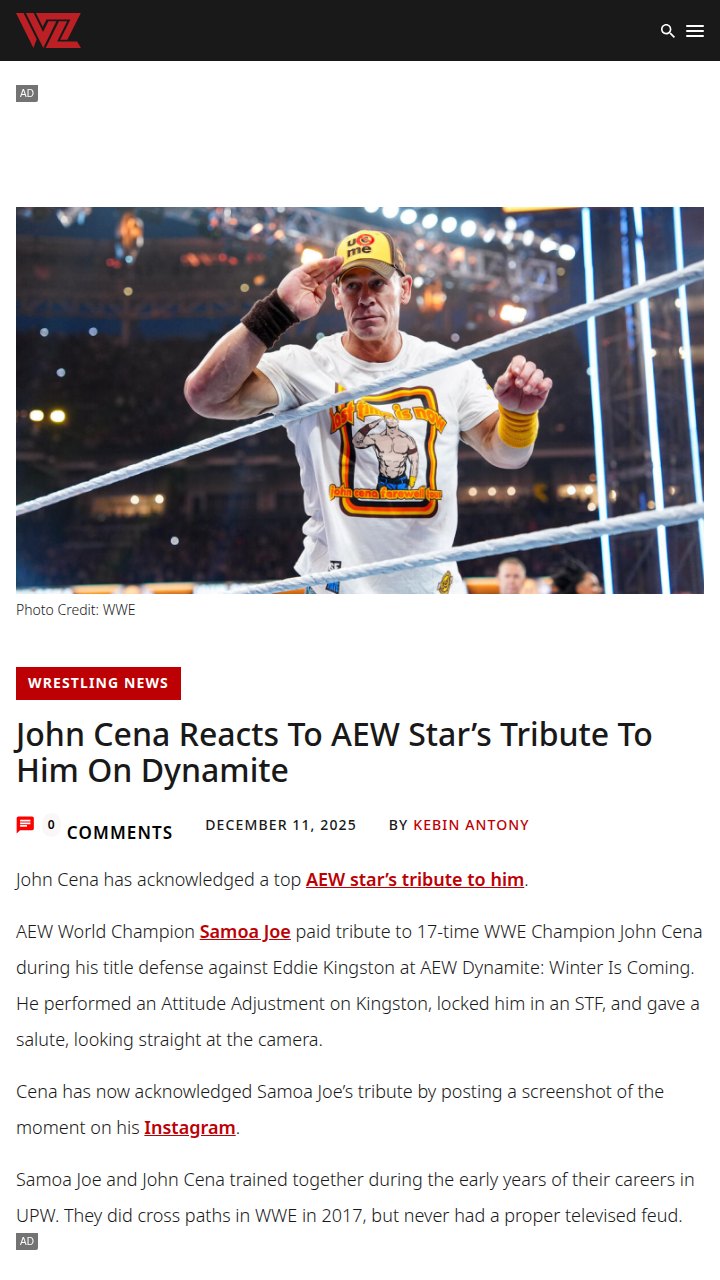 Stacie Lee+FollowSamoa Joe Salutes The Champ on DynamiteDid anyone catch Samoa Joe channeling his inner Champ on AEW Dynamite: Winter Is Coming? The AEW World Champ hit Eddie Kingston with an Attitude Adjustment, locked in the STF, and even gave a salute straight to the camera—a clear nod to King Cena. The best part? John Cena himself acknowledged the tribute on Instagram! Wild to see these two UPW alums showing respect, even if we never got that dream feud on WWE TV. Thoughts on Joe’s homage? #Sports #Wrestling #AEW20Share
