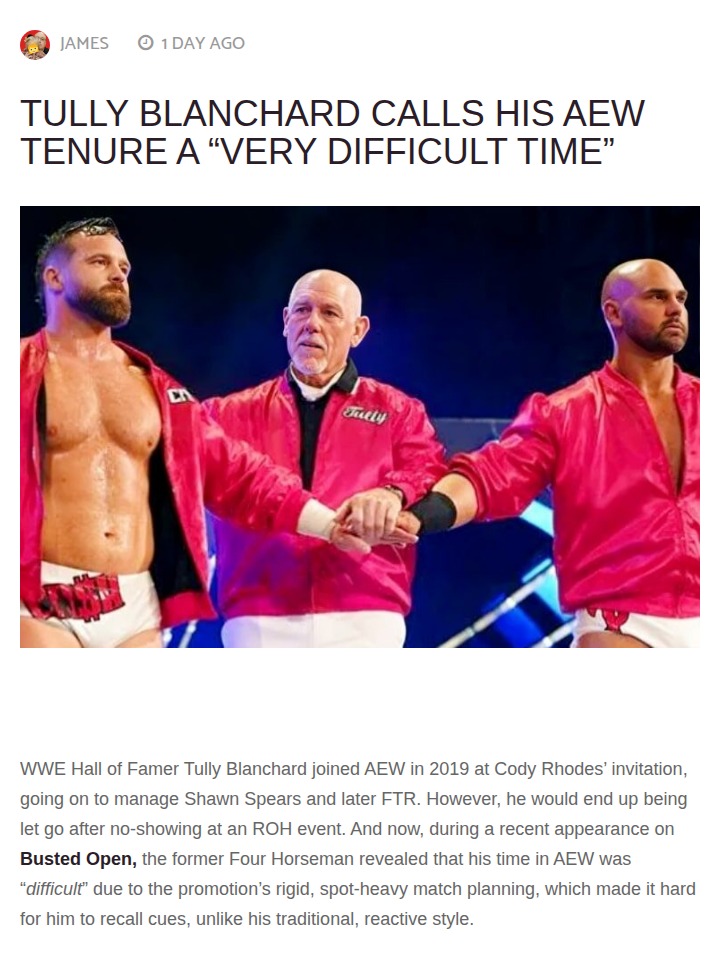 Stephanie Bailey+FollowTully Blanchard’s Tough AEW RideOld-school fans, what’s your take on Tully Blanchard’s AEW stint? The Four Horsemen legend just called his time with the company “very difficult,” blaming AEW’s rigid, spot-heavy match planning for his struggles. Tully says he was used to reading the crowd, not memorizing cues. Do you think AEW’s style is too tough for legends, or was this just a bad fit for the Enforcer? #Sports #Wrestling #AEW00Share