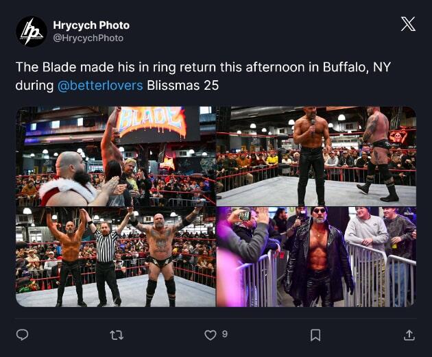 Angela Davis+FollowThe Blade’s Comeback: AEW Tag Team HypeHuge news for AEW diehards—The Blade is back in action after nearly two years out with a brutal back injury! Teaming up with The Butcher at Blissmas 25 in Buffalo, he looked fired up and ready. No word yet if we’ll see this tag team terror back on AEW TV or maybe in ROH, but fans of The Butcher & The Blade have reason to get excited. Could this be the start of a new run? #Sports #Wrestling #AEW20Share