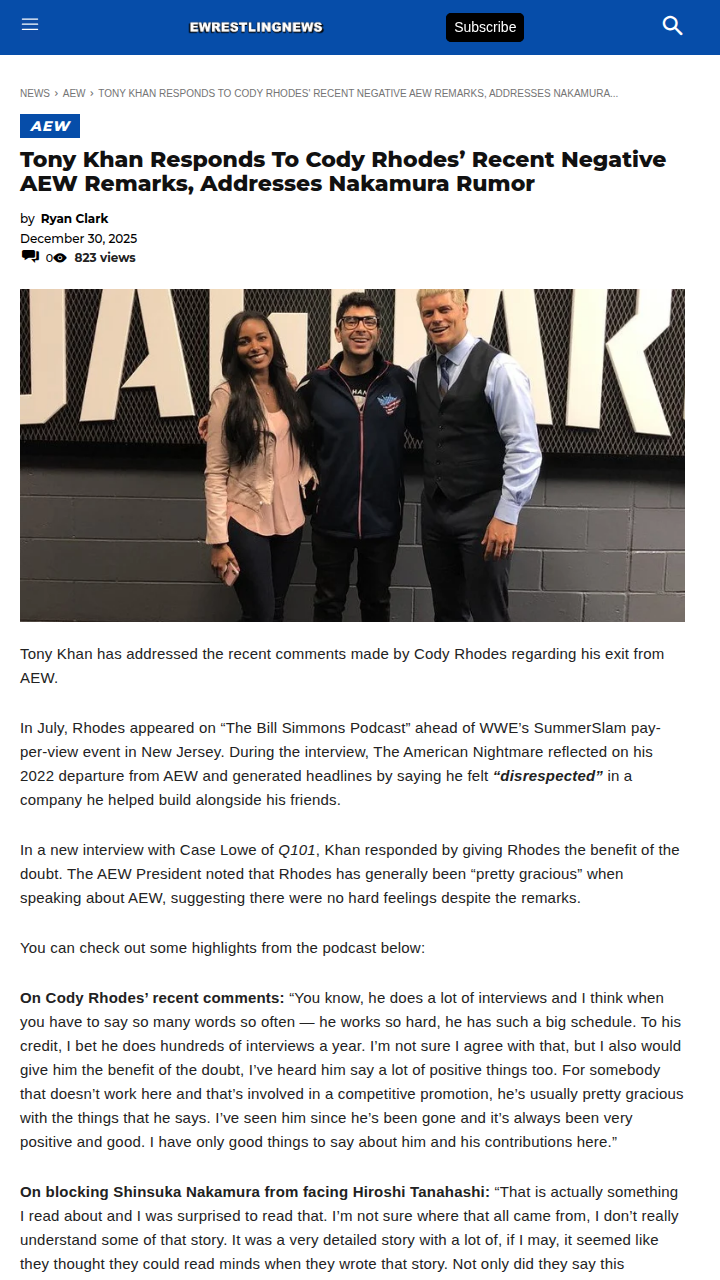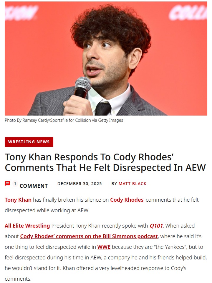 Kayla Mcconnell+FollowCody vs Tony: AEW Respect Debate Heats UpInteresting to see Tony Khan finally address The American Nightmare’s claims about feeling disrespected in AEW. Khan kept it classy, saying he doesn’t fully agree but still respects Cody’s hustle and legacy. This adds another layer to the ongoing AEW vs WWE rivalry—especially since Cody helped build AEW from the ground up. Do you think Cody’s comments were fair, or is this just part of the business? Let’s hear your takes! #Sports #Wrestling #AEW00Share