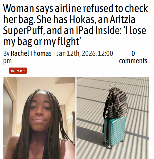 Eric Mueller+FollowDid Niamh Ditch Her Flight for Hokas? 🧳Niamh’s TikTok is blowing up after she claimed an airline refused to check her bag—with her Aritzia SuperPuff, Hokas, and iPad inside. Fans are debating if she made the right call skipping her flight to save her stuff. Was it a last-minute check-in fail or a lithium battery drama? The real plot twist: commenters say her bag was worth more than the trip! #Entertainment #TVSeries #airportdrama00Share