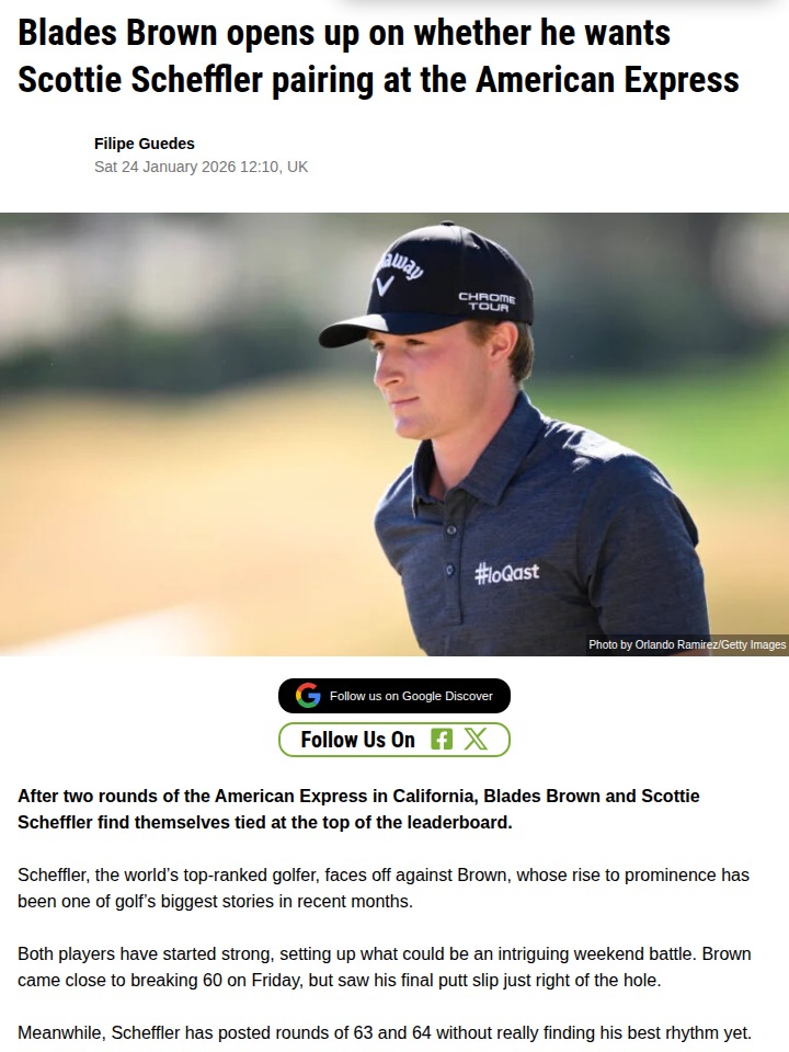 frank59+FollowBlades Brown vs Scottie Scheffler: American Express showdownBlades Brown, just 18, is matching world number one Scottie Scheffler shot for shot at the American Express in California. Brown nearly broke 60 on Friday, showing nerves of steel and a calm that’s rare for his age. Scheffler, meanwhile, admits he’s not even at his best yet but is still right at the top. Brown says he’d love to be paired with Scheffler on Sunday, eager to learn from the champ’s strategic play. This weekend could be the start of a new rivalry—who are you rooting for, the rising star or the established ace? #Sports #Golf #AmericanExpress00Share