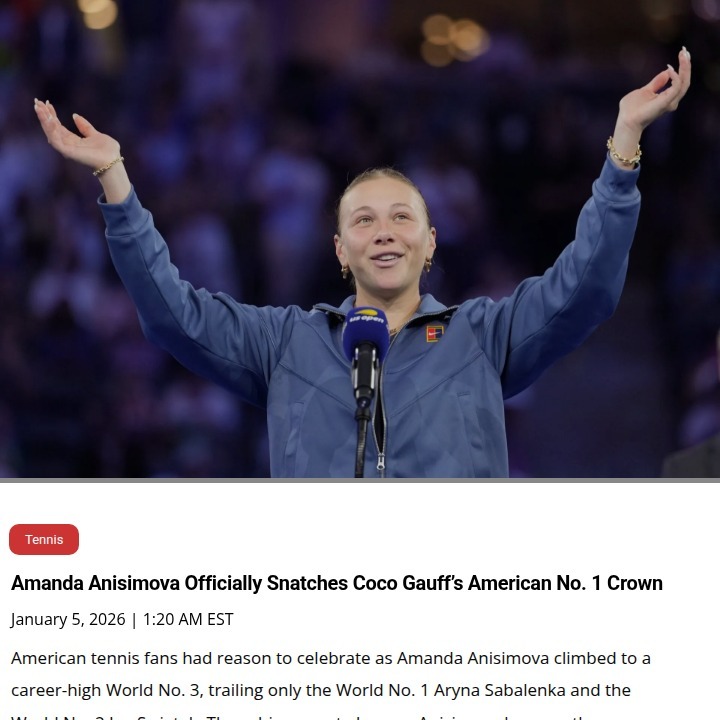 Nicholas Henderson+FollowAnisimova Dethrones Gauff as US No. 1Wow, what a comeback story for Amanda Anisimova! After her time away from the game, she’s now leapfrogged past Coco Gauff to become the new American No. 1, sitting at World No. 3 behind Swiatek and Sabalenka. The rivalry between Anisimova and Gauff just got a whole lot more interesting—can Gauff bounce back and reclaim her spot, or is Amanda here to stay at the top? #Sports #Tennis #Anisimova00Share