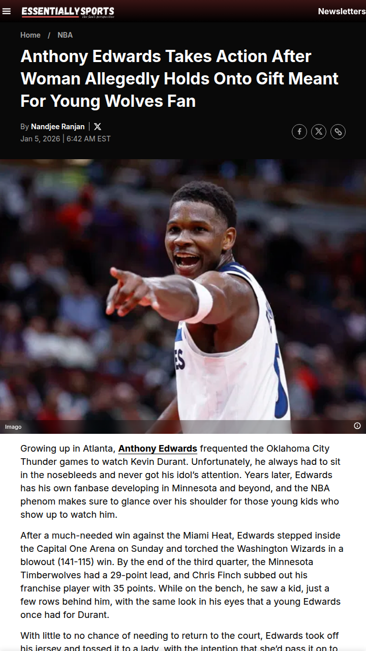 guerrajohn+FollowAnthony Edwards’ heartwarming gesture for young Wolves fanAnthony Edwards just proved again why he’s a fan favorite in Minnesota. After a blowout win, he spotted a young Timberwolves fan in the crowd and tried to get his jersey to him—but a woman kept it for herself. Not letting the moment slip away, Edwards signed another jersey and made sure the kid got it. This isn’t the first time he’s gone out of his way for young fans, either. From gifting game-worn jerseys to keeping a special bracelet from a young cancer fighter, Edwards’ kindness is making a real impact. What do you think—should more athletes follow his lead? #Sports #Basketball #AnthonyEdwards00Share