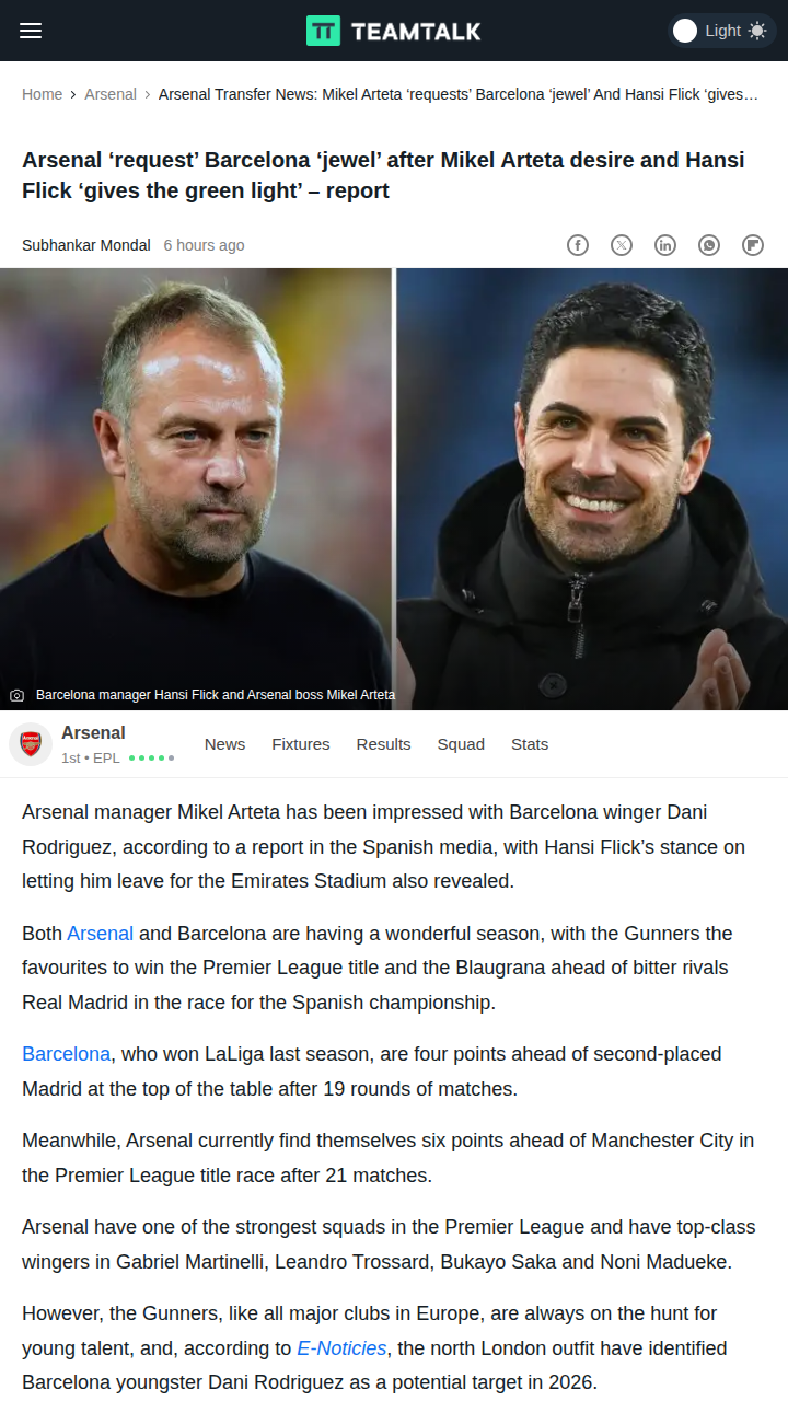 watkinsross+FollowGunners Eye Barca’s La Masia Gem for 2026Big news for Gooners and Culers! Word is that Mikel Arteta has his sights set on Barcelona’s rising star, Dani Rodriguez, as a future project for Arsenal. With Hansi Flick reportedly open to letting the La Masia jewel leave, could we see Rodriguez lighting up the Emirates in a couple of years? This move could add even more firepower to Arsenal’s already stacked wings. What do you think—would Rodriguez fit in with Saka and Martinelli? #Sports #Soccer #Arsenal00Share