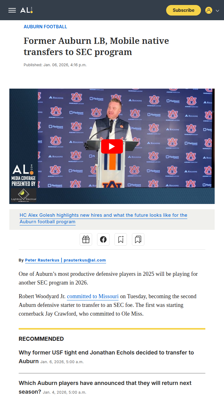 Jay Williams+FollowAuburn’s top tackler heads to MissouriAuburn fans, big news—Robert Woodyard Jr., last season’s second-leading tackler and a Mobile native, is leaving for Missouri. That’s two defensive starters now transferring to SEC rivals, with Jay Crawford already at Ole Miss. Woodyard racked up 67 tackles, seven for loss, and two sacks, making his move a real shake-up for Auburn’s defense. The Tigers haven’t brought in any transfer linebackers yet, just three freshmen. With the transfer portal open until Jan. 16, do you think Auburn should be more aggressive in recruiting experienced defenders? How will these changes impact the team next season? #Sports #Football #AuburnFootball00Share