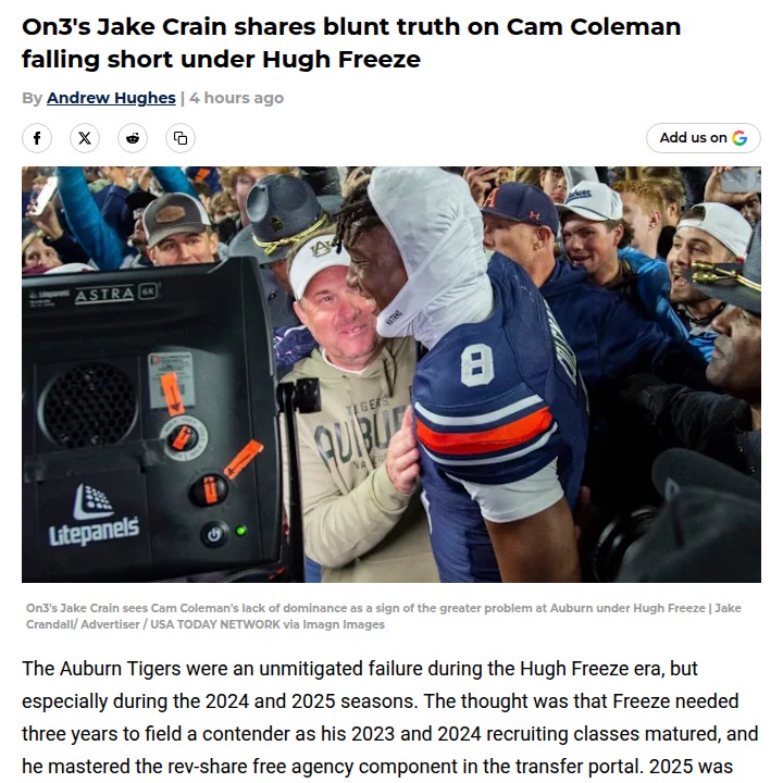 Aaron Taylor+FollowCam Coleman’s Portal Move: Auburn FalloutTough times on the Plains, y’all. Cam Coleman, once the Tigers’ crown jewel, is out after a messy Hugh Freeze era. On3’s Jake Crain didn’t hold back, saying Freeze’s soft approach with stars like Coleman led to a toxic locker room and Auburn’s collapse. Now, Coleman’s eyeing Texas or—brace yourselves—Bama. If he flips to the Tide, that’s a rivalry gut punch. Did Freeze lose the locker room, or was it just too much star power, not enough discipline? #Sports #Football #AuburnFootball00Share