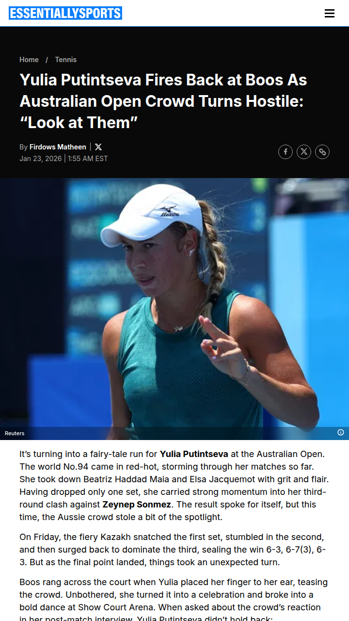 Reginald Gonzalez+FollowPutintseva Dances Through Boos at Aussie OpenYulia Putintseva is making headlines at the Australian Open—not just for her gritty play, but for her fiery response to a hostile crowd. After clinching a tough three-set win, the Kazakh sparkplug put her finger to her ear and broke into a dance, firing back at the boos from the stands. In her post-match chat, Putintseva embraced the drama, saying she thrives on that kind of energy. Love her or hate her, you can’t ignore her! #Sports #Tennis #AustralianOpen00Share