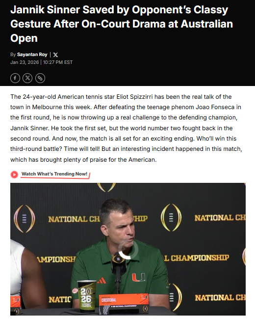 Stephen Wilson+FollowSinner’s AO Streak Snapped by Spizziri’s ClassWhat a wild ride at the Australian Open! Jannik Sinner’s 16-set win streak was finally broken by the fearless American, Eliot Spizziri, who took the opening set 6-4. But the real story? After a tense time violation call against Sinner, Spizziri showed pure class by telling the ump he wasn’t ready either, urging the penalty be dropped. That’s the kind of sportsmanship that makes tennis great! #Sports #Tennis #AustralianOpen00Share