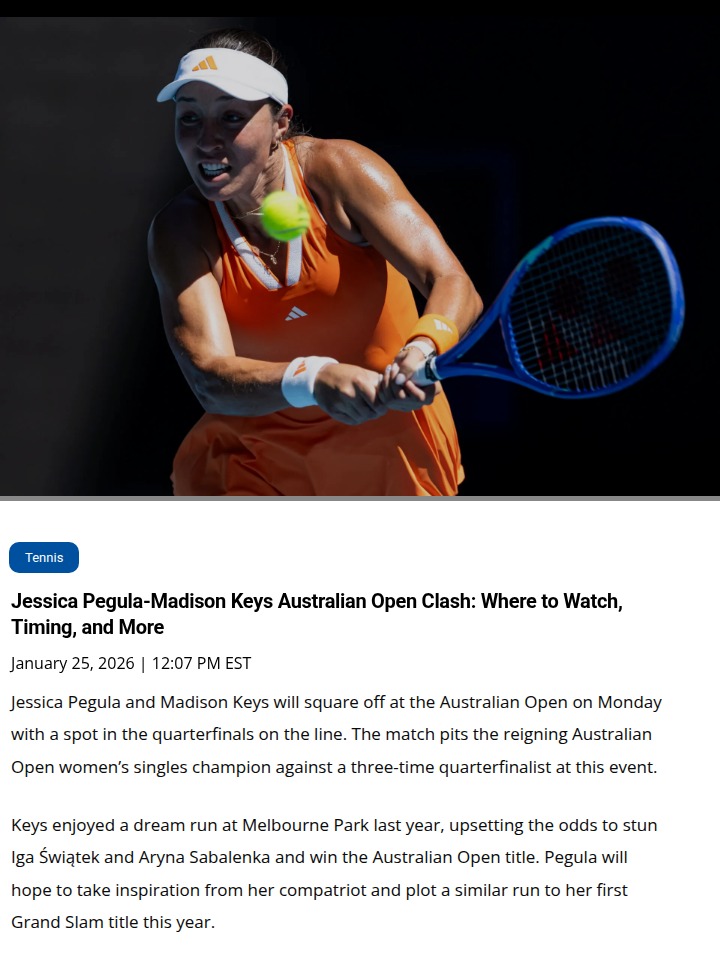 Nicholas Henderson+FollowPegula vs Keys: Can Jessie Stop Mad Magic?All eyes are on Rod Laver Arena as Jessie Pegula takes on Madison “Mad Magic” Keys in a high-stakes Australian Open showdown. Keys, last year’s champ, has a 2-1 edge in their rivalry and hasn’t dropped a set this tournament. But Pegula’s hungry for her first Slam and looking to flip the script. Will Keys’ title defense survive, or is it Pegula’s time to shine? Let’s hear your predictions! #Sports #Tennis #AustralianOpen00Share