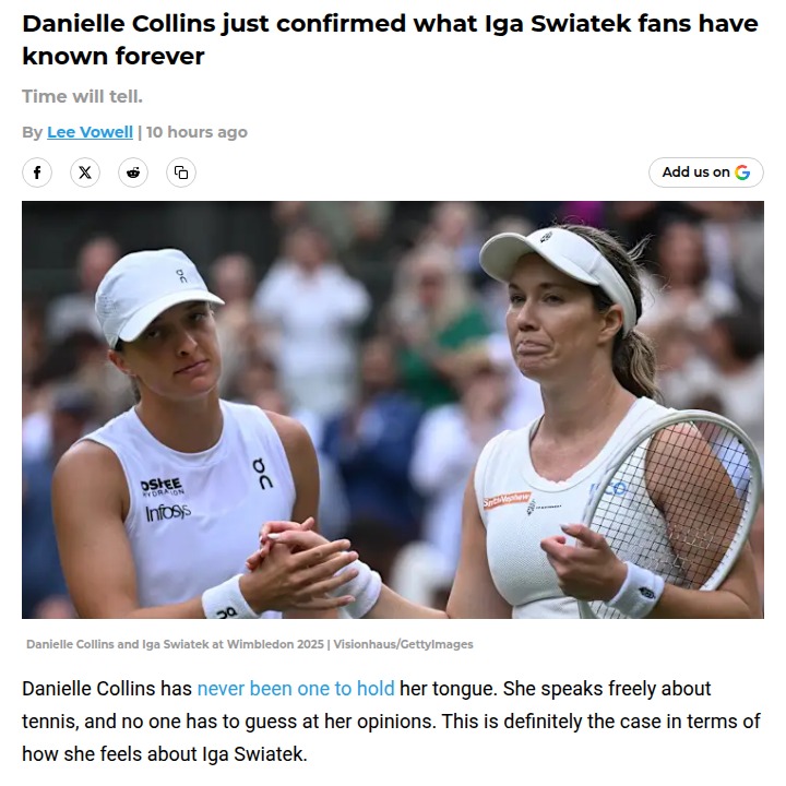 Kelly Jones+FollowCollins Doubts Swiatek at Australian Open 2026Danimal Collins isn’t holding back—again. After her Olympic spat with Iga “the Pole” Swiatek, Collins went on Tennis Channel and threw more shade, saying she doesn’t see Swiatek making a deep run in Melbourne this year. With Swiatek’s shaky United Cup form and a tough draw ahead, is Collins onto something, or just fueling the rivalry? Can Swiatek finally conquer the Aussie hard courts and prove the doubters wrong? #Sports #Tennis #AustralianOpen10Share