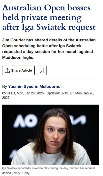 Stephen Wilson+FollowAO Schedule Drama: Swiatek vs. Inglis in PrimetimeInsider scoop from the AO: Second seed Iga Swiatek wanted a day match, but Aussie TV execs pushed hard for local hero Maddison Inglis to play under the lights. After a tense backroom battle, Swiatek’s request was denied—she’ll face Inglis in the night session. Courier says this kind of scheduling tug-of-war is classic AO! Who do you think benefits more from the primetime slot? #Sports #Tennis #AustralianOpen00Share