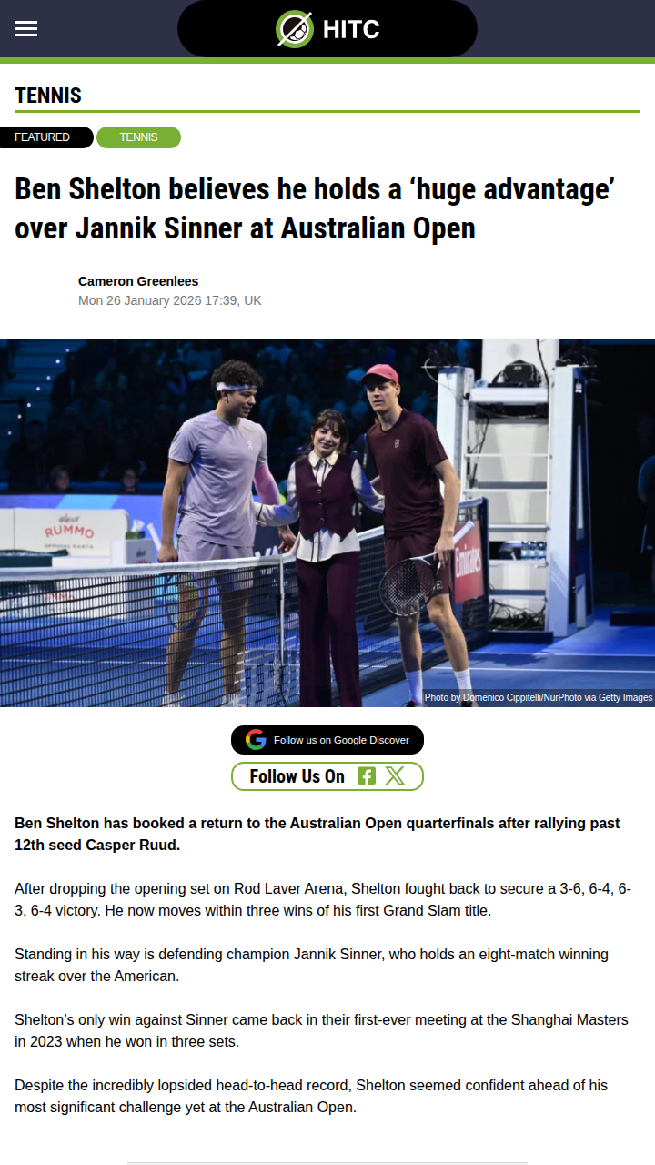 Dawn Fritz+FollowShelton Eyes Upset Over Sinner Down UnderBen “Big Ben” Shelton is talking a big game ahead of his Australian Open showdown with the Ice Man, Jannik Sinner. Despite Sinner’s dominant 8-1 record in their head-to-head, Shelton believes his revamped net play and booming forehand give him a real shot at breaking Sinner’s streak. With a semi-final spot on the line, can Shelton’s new approach finally crack the defending champ? #Sports #AustralianOpen #SheltonVsSinner00Share