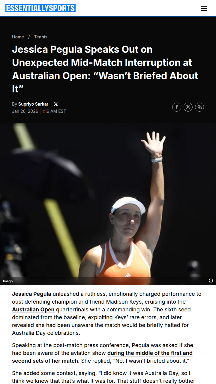 tammy84+FollowPegula Unfazed by Australia Day Air ShowTalk about composure! Jessica Pegula, aka the Bills Heiress, powered past Maddy Keys to book her spot in the Aussie Open quarters, but it was the mid-match Australia Day air show that had fans buzzing. Pegula admitted she wasn’t briefed about the interruption, but stayed ice-cool and kept her focus. Anyone else think these national celebrations add a wild card to the Grand Slam drama? #Sports #Tennis #AustralianOpen00Share