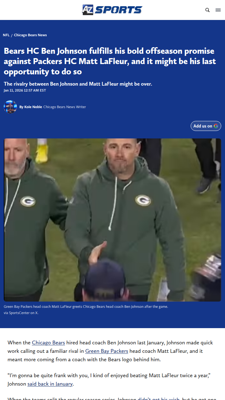 Chad Williams+FollowBears-Packers: Ben Johnson’s Promise DeliveredBen Johnson, the new Bears HC, made headlines last offseason promising to take down Matt LaFleur’s Packers—and he finally delivered in the NFC playoffs. The Bears heard all the noise from up north and used it as fuel, with rookie QB Caleb Williams saying, “They wanted it. And they got it.” Now, with LaFleur’s future in Green Bay uncertain, this rivalry just got even more interesting. Did the Bears just end an era? #Sports #Football #BearsNation10Share