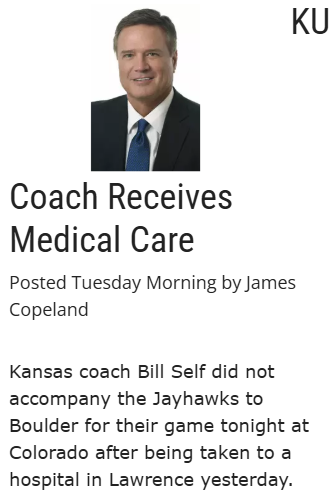 CrimsonChameleon+FollowBill Self’s health keeps him off KU bench tonightKansas fans, tonight’s game against Colorado will feel different—Coach Bill Self won’t be with the Jayhawks after a hospital visit in Lawrence. He’s reportedly feeling better after IV fluids, but his recent heart issues make this absence hit home for a lot of us. With Self’s legendary leadership and 609 wins, it’s a big shift for the team and the community. How do you think KU will respond on the court without him? Should the program be more cautious with his health moving forward? Let’s talk about what this means for the Jayhawks’ season. #Sports #KUbasketball #BillSelf00Share
