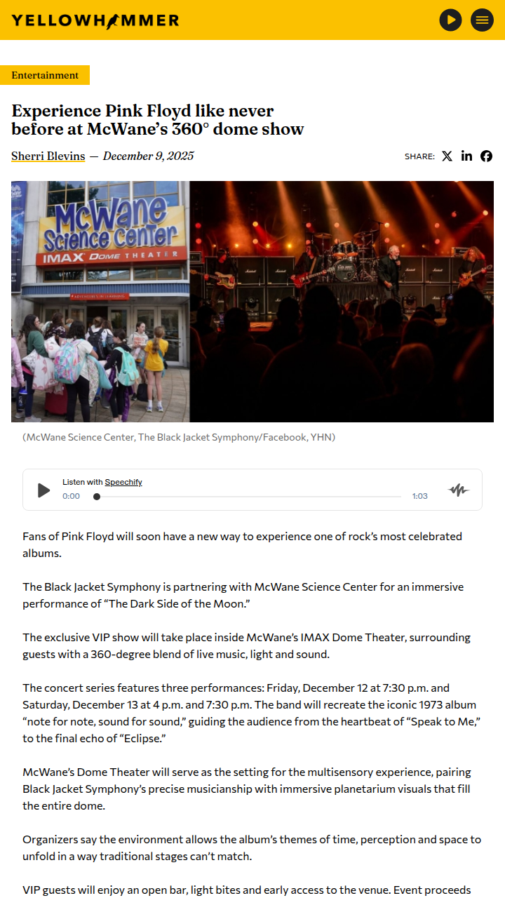 Casey Sutton+FollowBirmingham’s dome transforms Pink Floyd’s soundImagine hearing every heartbeat and echo of Pink Floyd’s “The Dark Side of the Moon” while surrounded by mind-bending visuals in a 360° dome. That’s what’s coming to McWane Science Center, as Black Jacket Symphony brings the iconic album to life in a way that goes way beyond a typical concert. With immersive sound, planetarium-style lights, and a VIP experience (open bar, early entry, and bites), this is set to be a night Birmingham music lovers won’t forget. Plus, your ticket helps support local science education. Who’s planning to go, and which track are you most excited to experience in this setting? #Entertainment #Music #Birmingham00Share