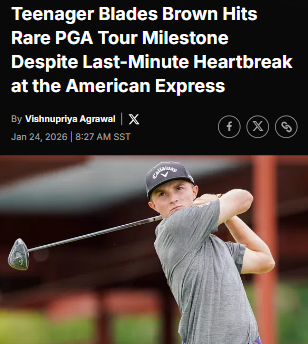 Gabriella Gonzalez+FollowBlades Brown’s 60: The Kid Shakes Up AmExDid you catch The Kid at PGA West? Blades Brown, just 18, nearly joined golf’s 59 club with a course-record 60 at The American Express. That seven-foot birdie putt on 18 just missed, but Brown’s fearless play and maturity are turning heads. His decision to skip college and go pro is already paying off. Anyone else think we’re witnessing the start of a new rivalry with the big names? #Sports #Golf #BladesBrown00Share