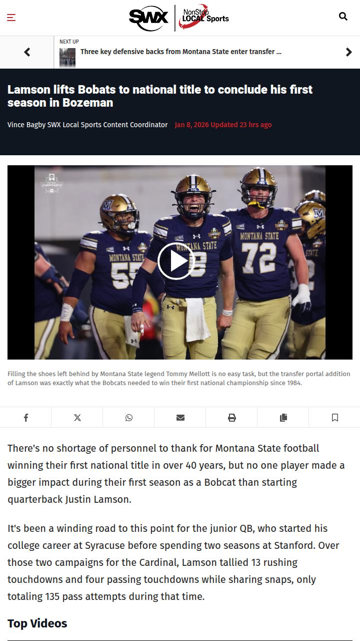 glen25+FollowLamson’s Heroics End Bobcats’ 40-Year DroughtHow about Justin “The Roadrunner” Lamson? In his first season in Bozeman, the transfer QB put the Bobcats on his back and delivered Montana State’s first national title since 1984! Taking over for legend Tommy Mellott, Lamson racked up over 3,000 passing yards, 700+ rushing, and 42 total TDs. That’s how you silence doubters and etch your name in Bobcat lore. Can he run it back next year? #Sports #Football #BobcatNation00Share