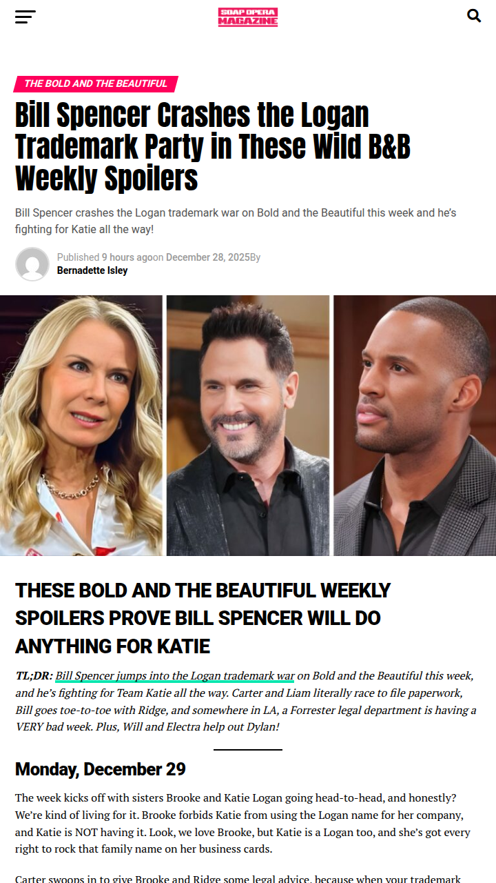 georgebryant+FollowBill & Ridge’s Wild Showdown This Week! 🔥Bill Spencer is going all-in for Katie during the Logan trademark chaos on B&B! He’s literally racing Carter and Liam to the patent office, and his epic face-off with Ridge is pure soap gold. Fans are split: is Bill saving Katie or just stirring up more Logan drama? Brooke vs. Katie is getting intense, and the Forrester legal team can’t catch a break. Team Brooke or Team Katie? Sound off below! #Entertainment #TVSeries #BoldandBeautiful61Share