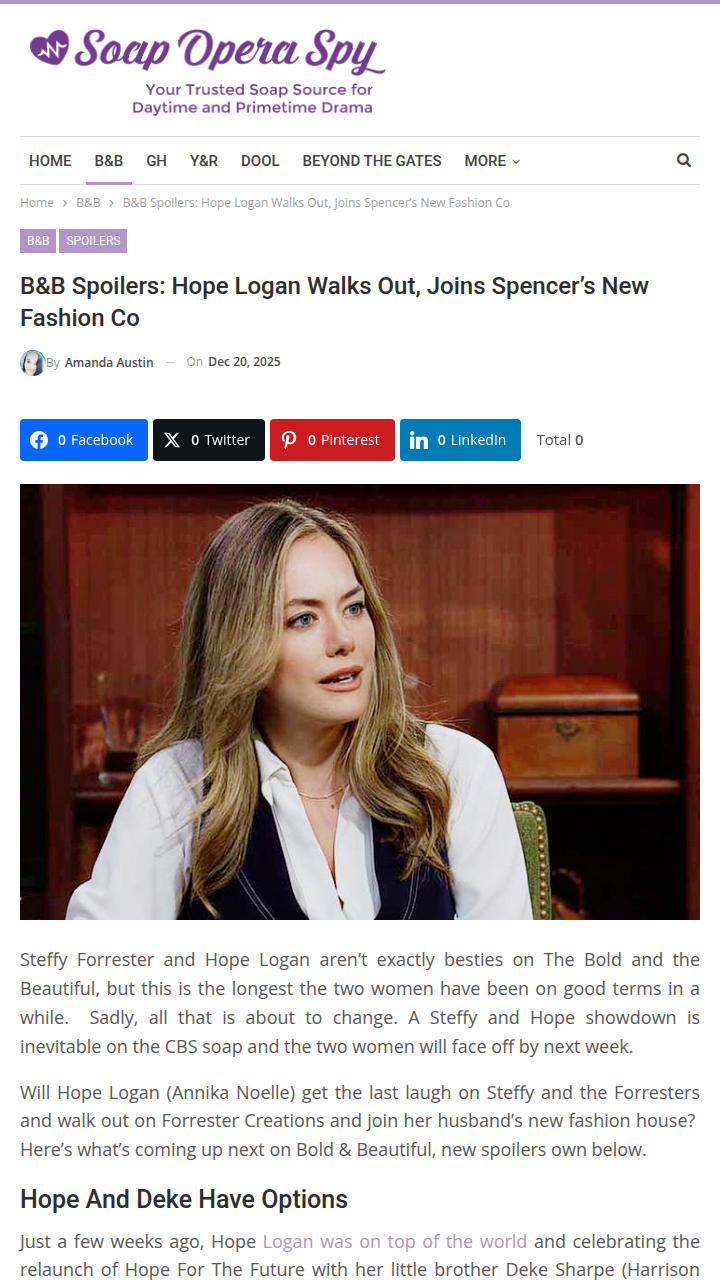 Jennifer ArnoldFollowingHope Logan Quits FC for Spencer’s Co! 👗Hope Logan is DONE with Steffy Forrester’s power moves at Forrester Creations! After Steffy fires Hope’s brother Deke to make room for Thomas, Hope’s not sticking around to take more drama. Rumor is, she’s about to walk out and join her husband’s family at Spencer’s new fashion house. Will this be the ultimate payback? Are you Team Steffy or Team Hope? The fandom is totally split! #Entertainment #TVSeries #BoldandBeautiful4916Share