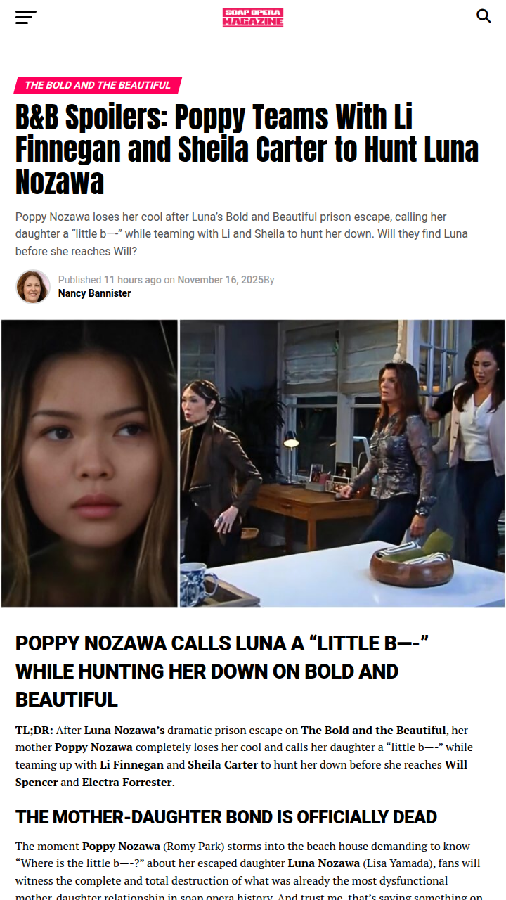 Eric Mueller+FollowPoppy’s Savage Betrayal 😱 B&B Fans StunnedPoppy Nozawa just called her own daughter Luna a “little b—-” and is now teaming up with Li Finnegan and Sheila Carter to hunt her down after Luna’s prison escape! The dysfunctional mother-daughter bond is totally shattered, and fans are losing it over Poppy’s cold-hearted move. Is this the wildest alliance in Bold and Beautiful history? Will Luna get caught before she reaches Will and Electra? The drama is next-level! #Entertainment #TVSeries #BoldandBeautiful507Share