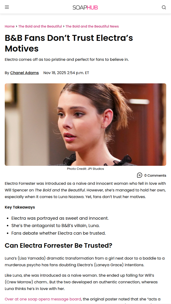 Eric Mueller+FollowElectra’s Sweet Act or Secret Schemer? 🤔Electra Forrester’s “innocent” persona on B&B has fans split. She was introduced as sweet, but her rivalry with Luna Nozawa and sudden closeness to Will Spencer have people questioning if she’s got a hidden agenda. Some say she’s just independent, others think she’s playing everyone. Is Electra really as genuine as she seems, or is a major plot twist coming? #Entertainment #TVSeries #BoldandBeautiful235Share