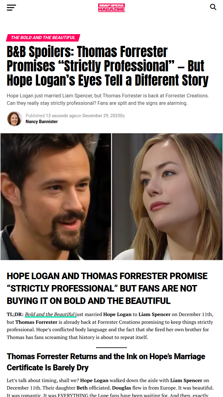 Cathy Porter+FollowHope & Thomas: Is 'Strictly Professional' a Joke? 👀Hope Logan and Thomas Forrester are promising to keep things 'strictly professional' at Forrester Creations, but the fandom is not convinced. Hope just fired her own brother to make room for Thomas, and her body language is giving major déjà vu to their last scandal. With Thomas newly single and Liam distracted, fans are debating if Hope is about to repeat history. Is this the start of another messy triangle? #Entertainment #TVSeries #BoldandBeautiful00Share